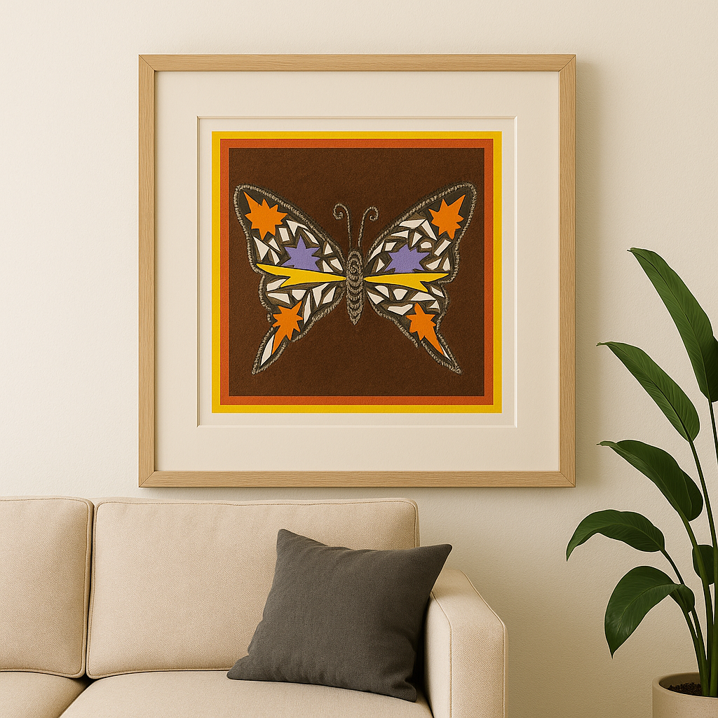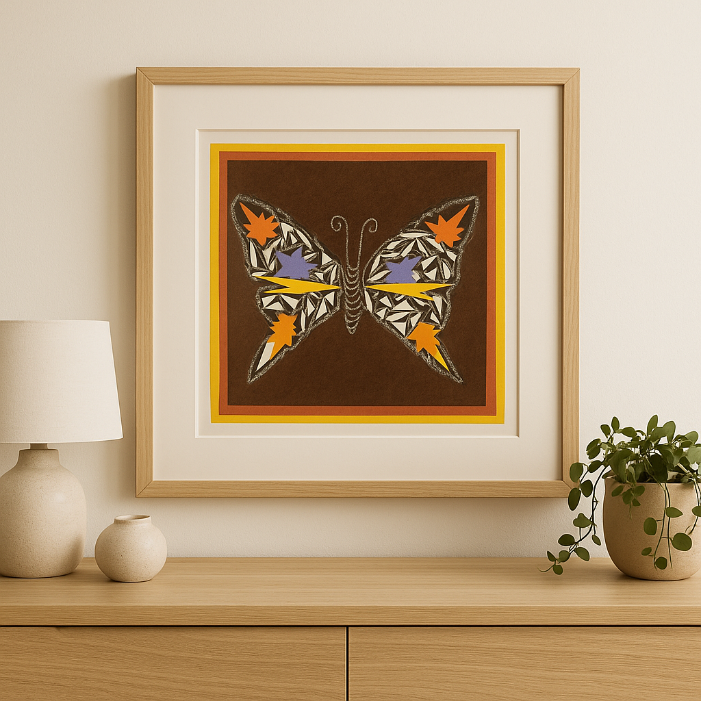 A vibrant mixed-media butterfly collage crafted with cut-paper geometric shapes and soft pastel accents. The warm orange, yellow, and purple tones evoke the colors of fall, while the dark brown backdrop adds depth and contrast. A beautifully framed, one-of-a-kind decorative piece that brings warmth and creativity to any room.