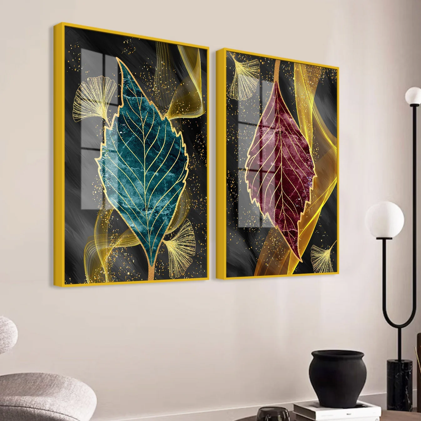 Bring sophistication and natural beauty into your space with this striking dual-panel glass artwork. Each piece features a delicately detailed leaf — one in rich burgundy, the other in deep teal — set against a flowing gold-accented background that captures light from every angle.