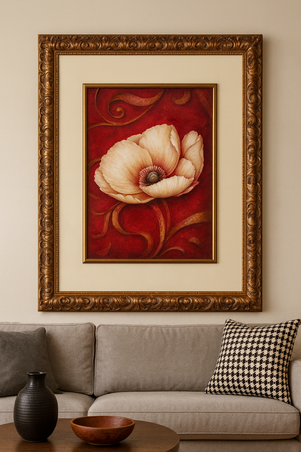 The ornate gold frame with carved detailing enhances the painting’s luxurious feel, making it a standout center-piece for living rooms, hallways, and sophisticated interiors. This artwork balances vibrancy and calm — ideal for anyone who appreciates floral art with a regal, timeless touch.