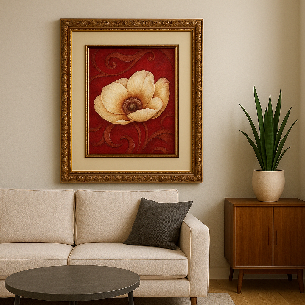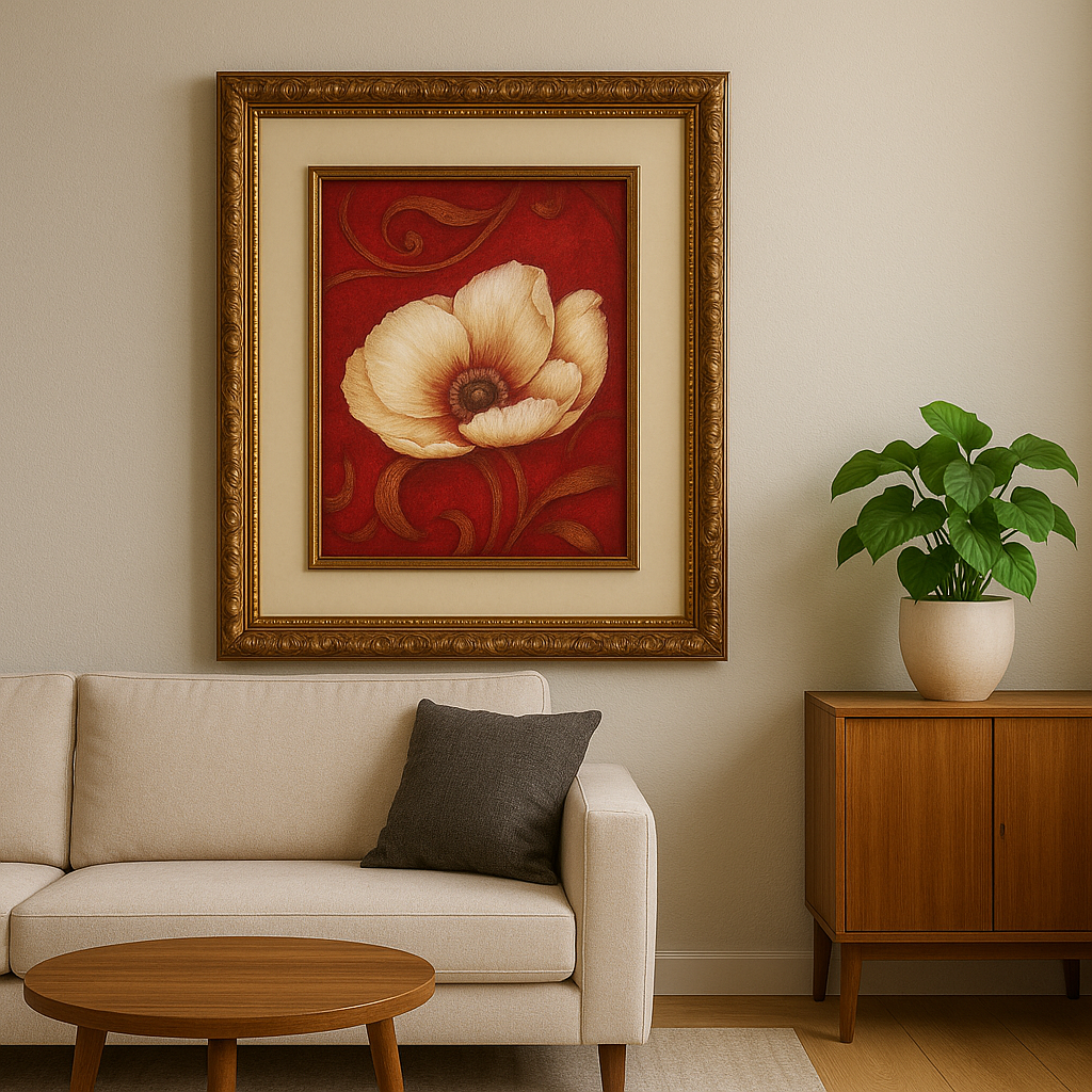 Golden Bloom on Crimson is a striking floral artwork that captures elegance, warmth, and bold expression in a single frame. A soft, golden-yellow flower blooms against a rich crimson red background, creating a powerful contrast that draws the eye immediately. Subtle swirling patterns blend into the backdrop, adding depth, movement, and a touch of classical charm.