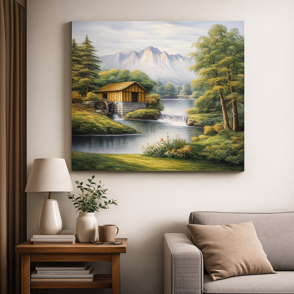 This piece showcases a peaceful riverside cottage with a waterwheel, framed by soft green foliage and majestic mountains under calm skies. Rich textures and natural tones make it an elegant focal point in living rooms, bedrooms, offices, or hallways.