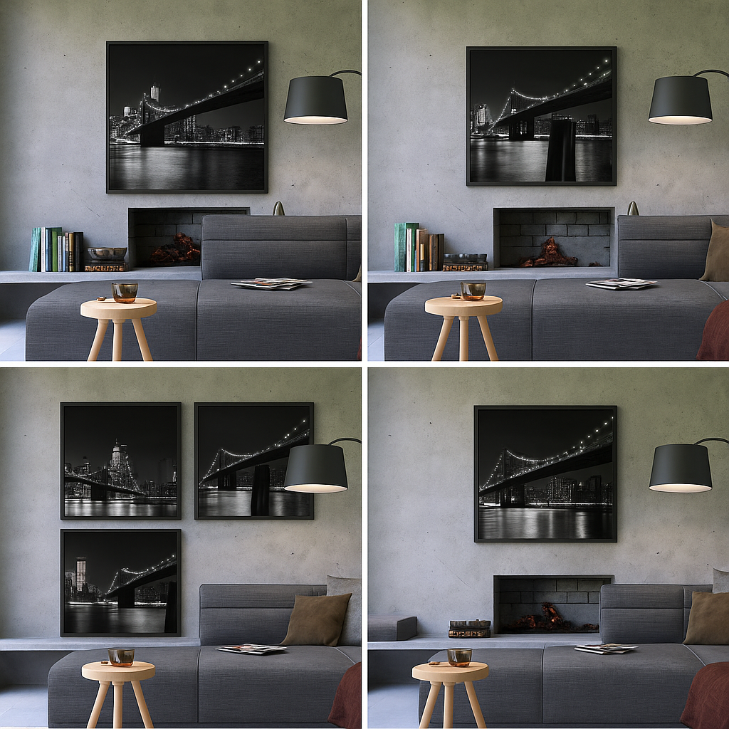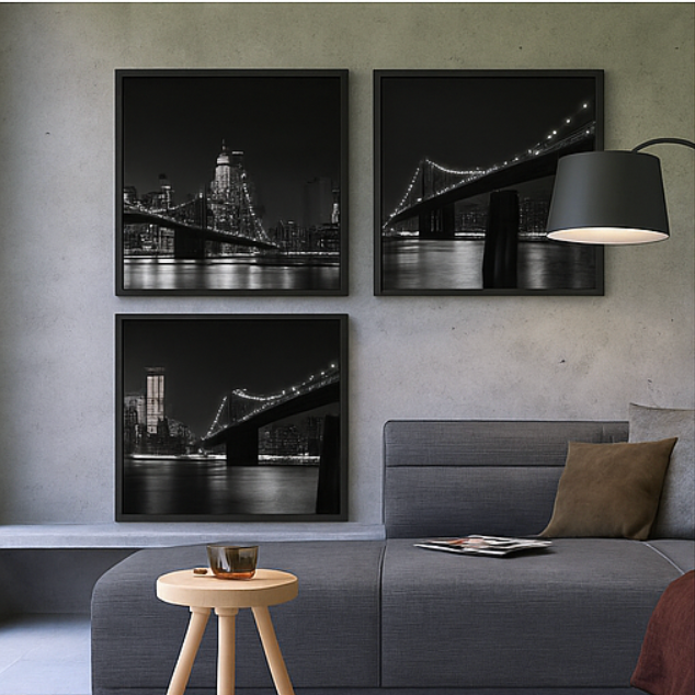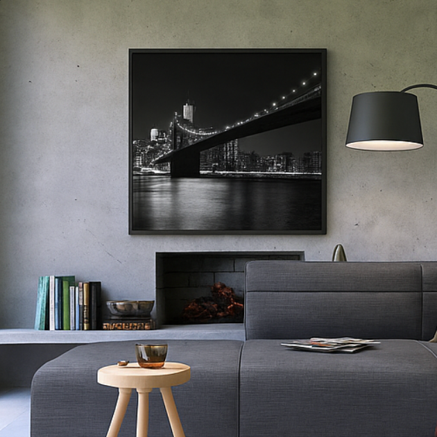 Midnight Reflections captures the quiet strength of the city at night — a seamless blend of architecture, light, and water. The glowing bridge stretches across the skyline, its reflections dancing on the river below, evoking both stillness and movement. Shot in timeless black and white, this photograph embodies urban elegance and modern serenity, perfect for contemporary interiors seeking a sophisticated focal point.